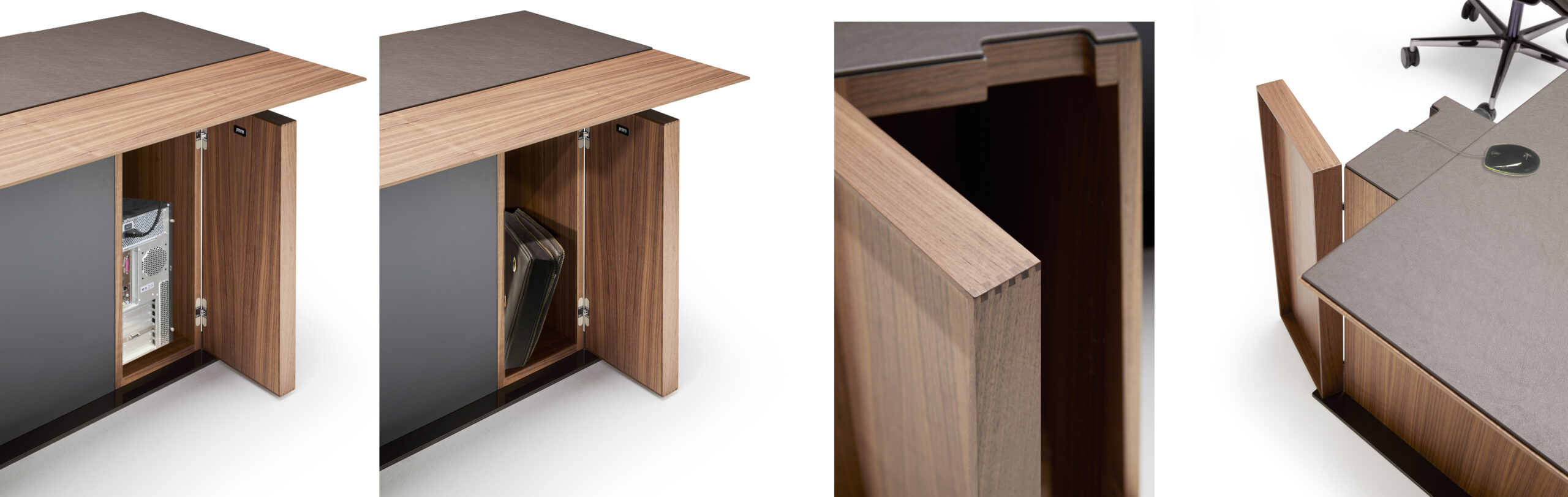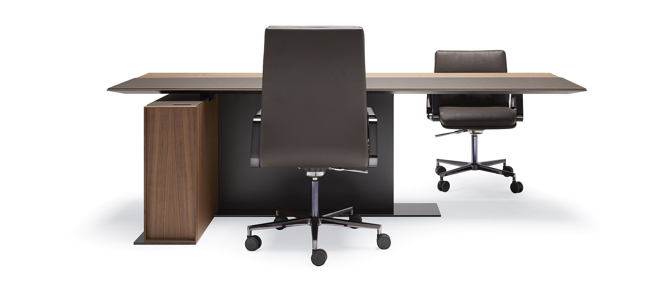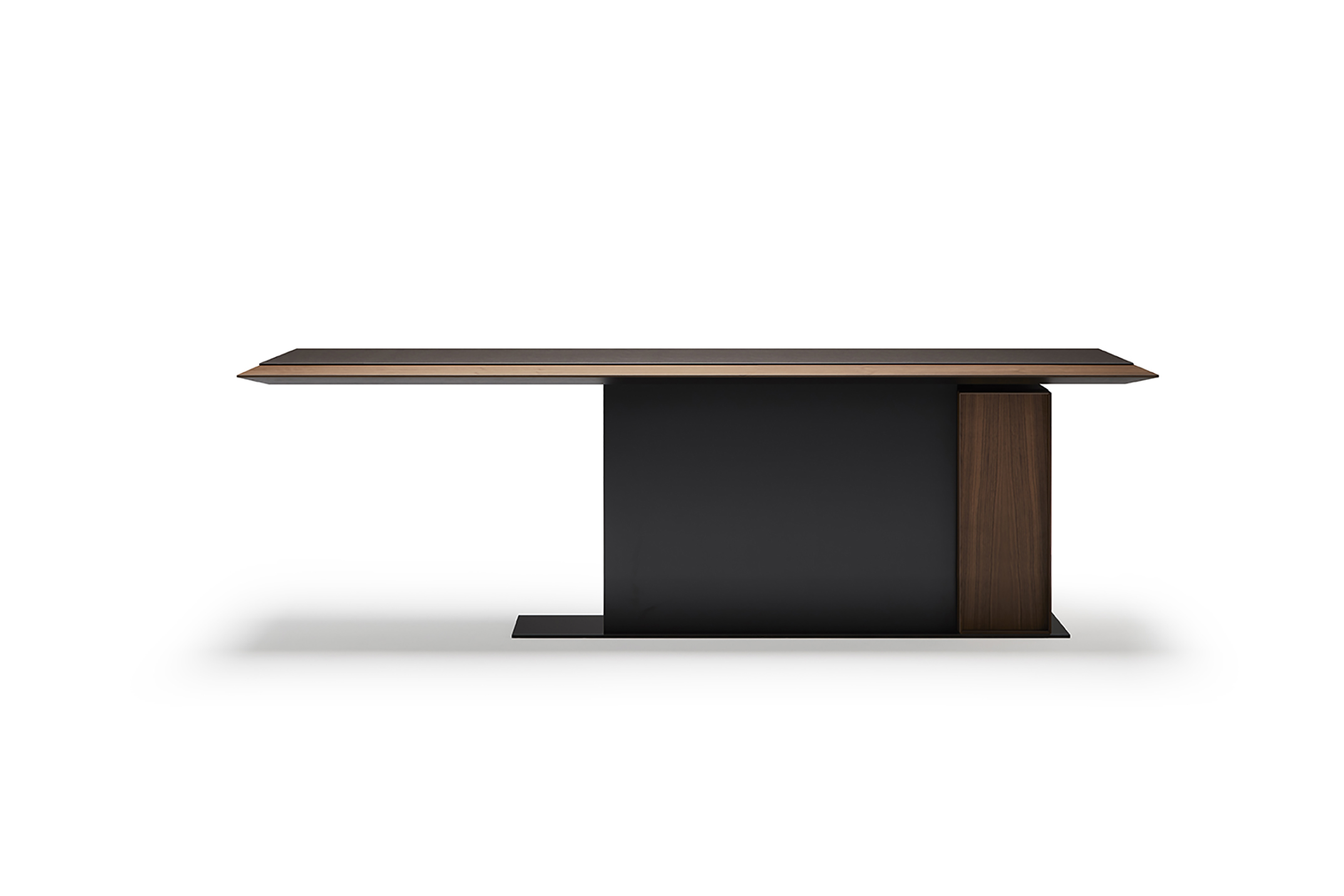 Rectangular table top. Top resting on a structural frontboard and side container accessible from both sides (front and back of the desk) to facilitate the cable management. Working area with overtop upholstered in Tech Leather.
