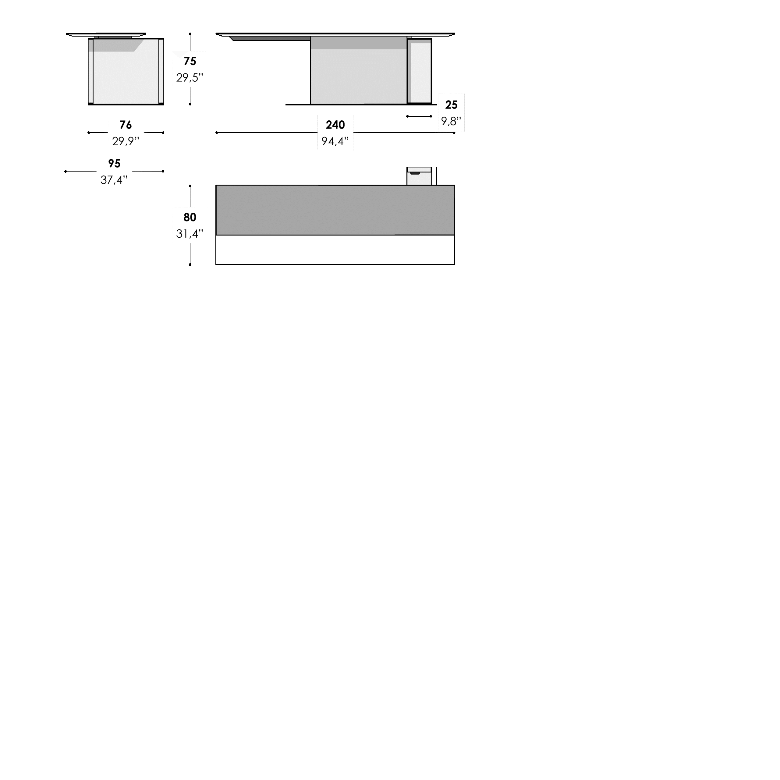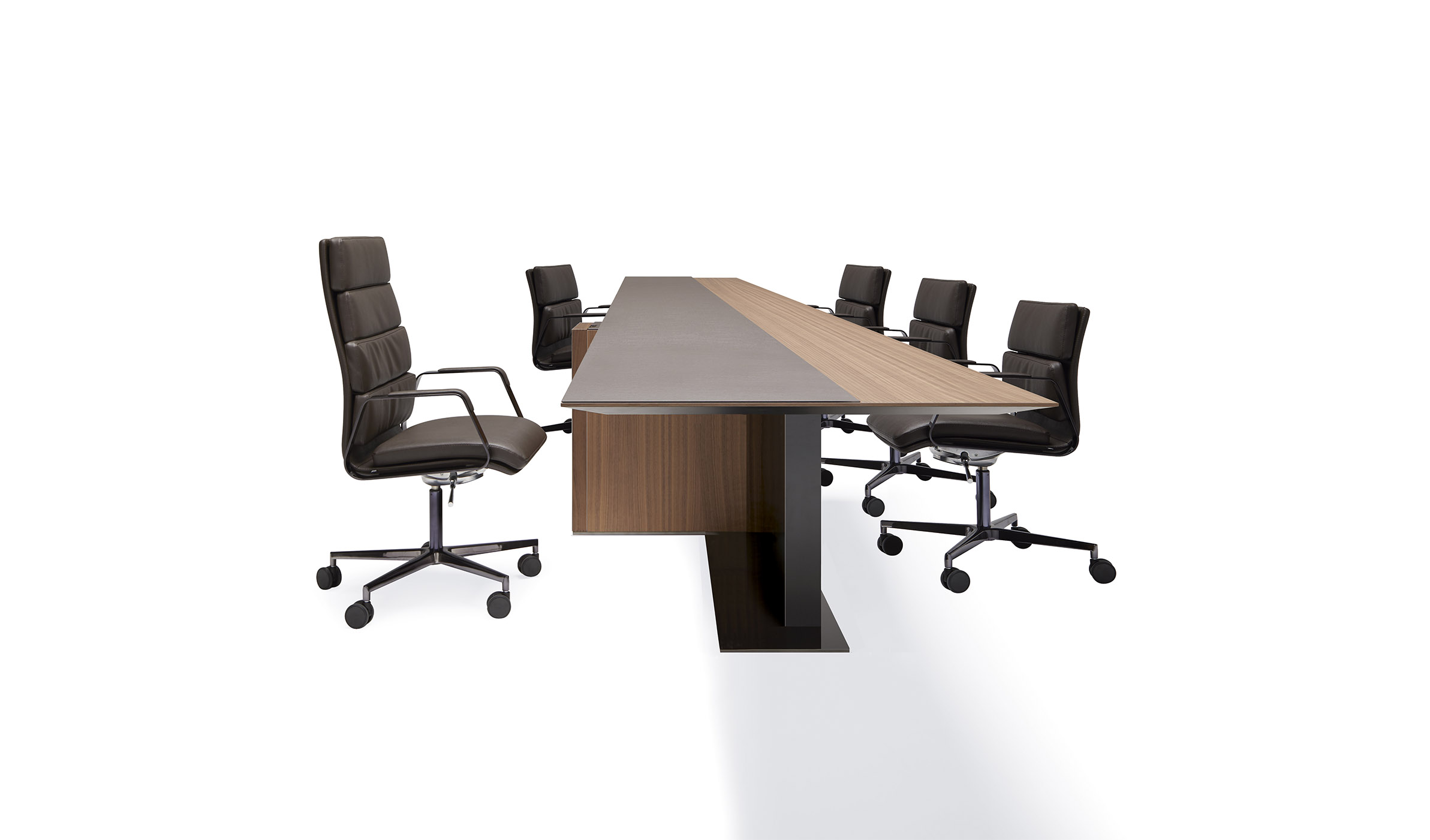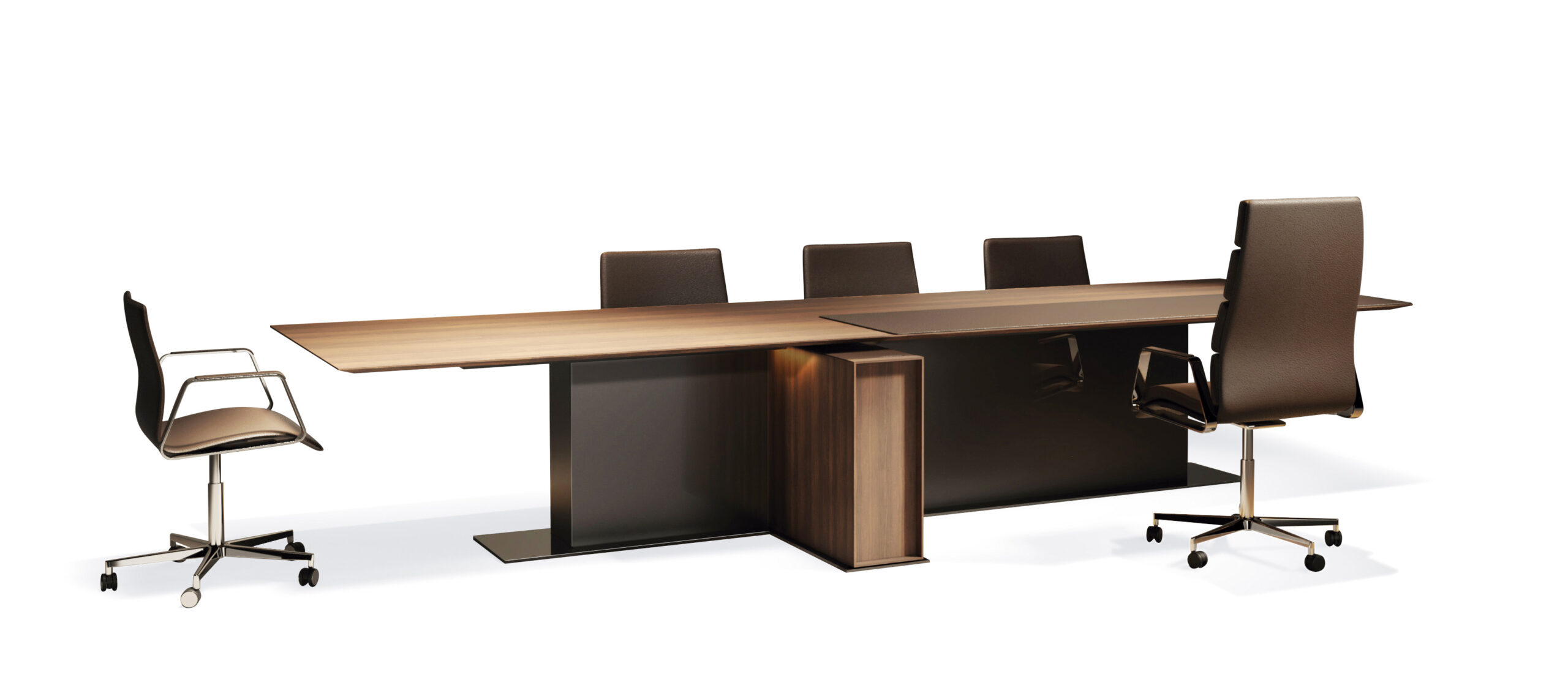 Rectangular table top. Top resting on a structural frontboard and side container accessible from both sides (front and back of the desk) to facilitate the cable management. Working area with overtop upholstered in Tech Leather.